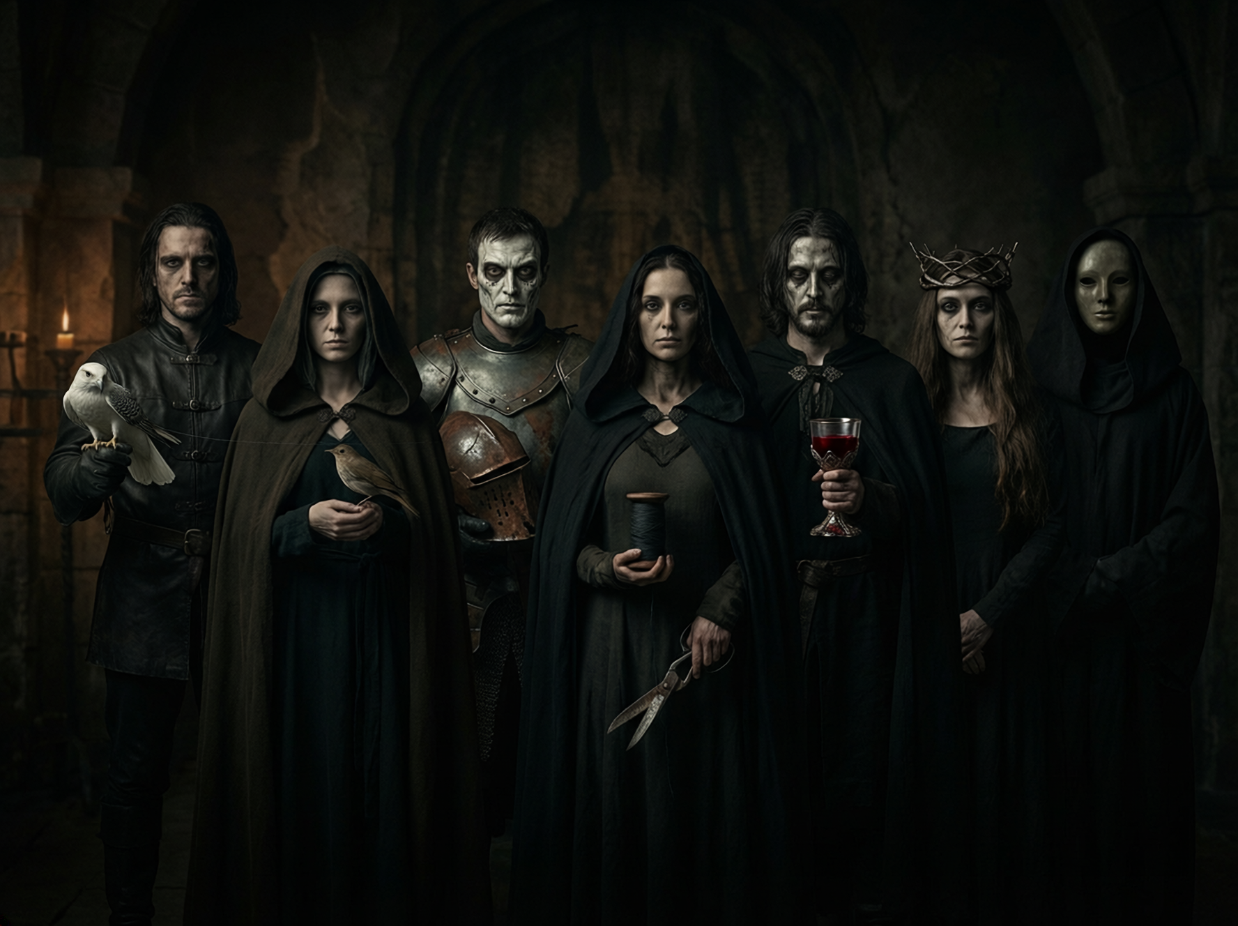 Symbols: A hollow crown; a veil of shadows; an open grave that emits light.